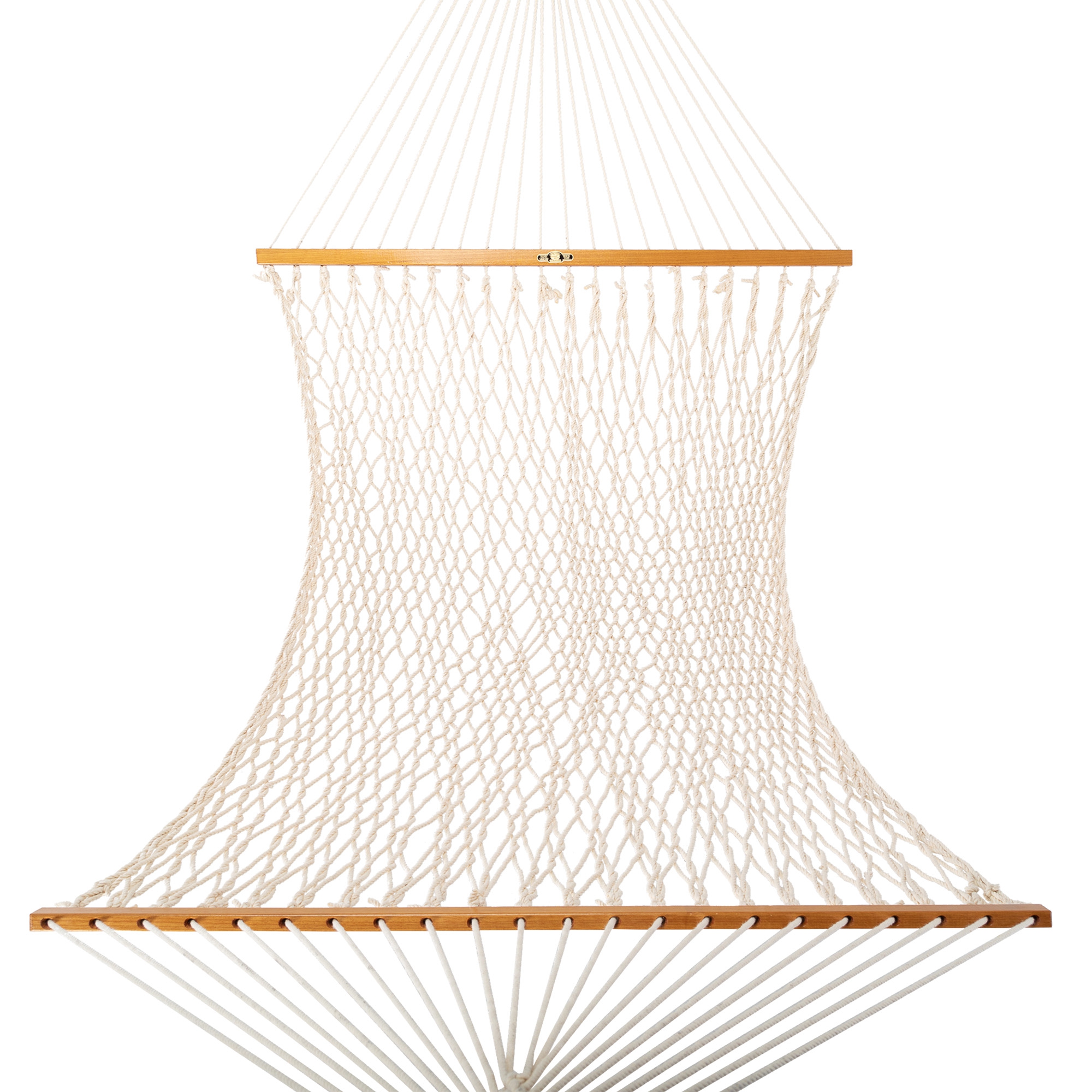 Appearances can fool you. Have you been looking for a hammock that "looks like" cotton rope and, even more importantly, feels like cotton rope? Our oatmeal colored DURACORD® is just that, plus something altogether more — more durable, that is!Its spacious size makes it ideal for two people, offering a luxurious haven for relaxation in your backyard, patio, or garden. Whether you're enjoying quiet moments alone or sharing them with a loved one, this hammock is crafted to provide the ultimate comfort.