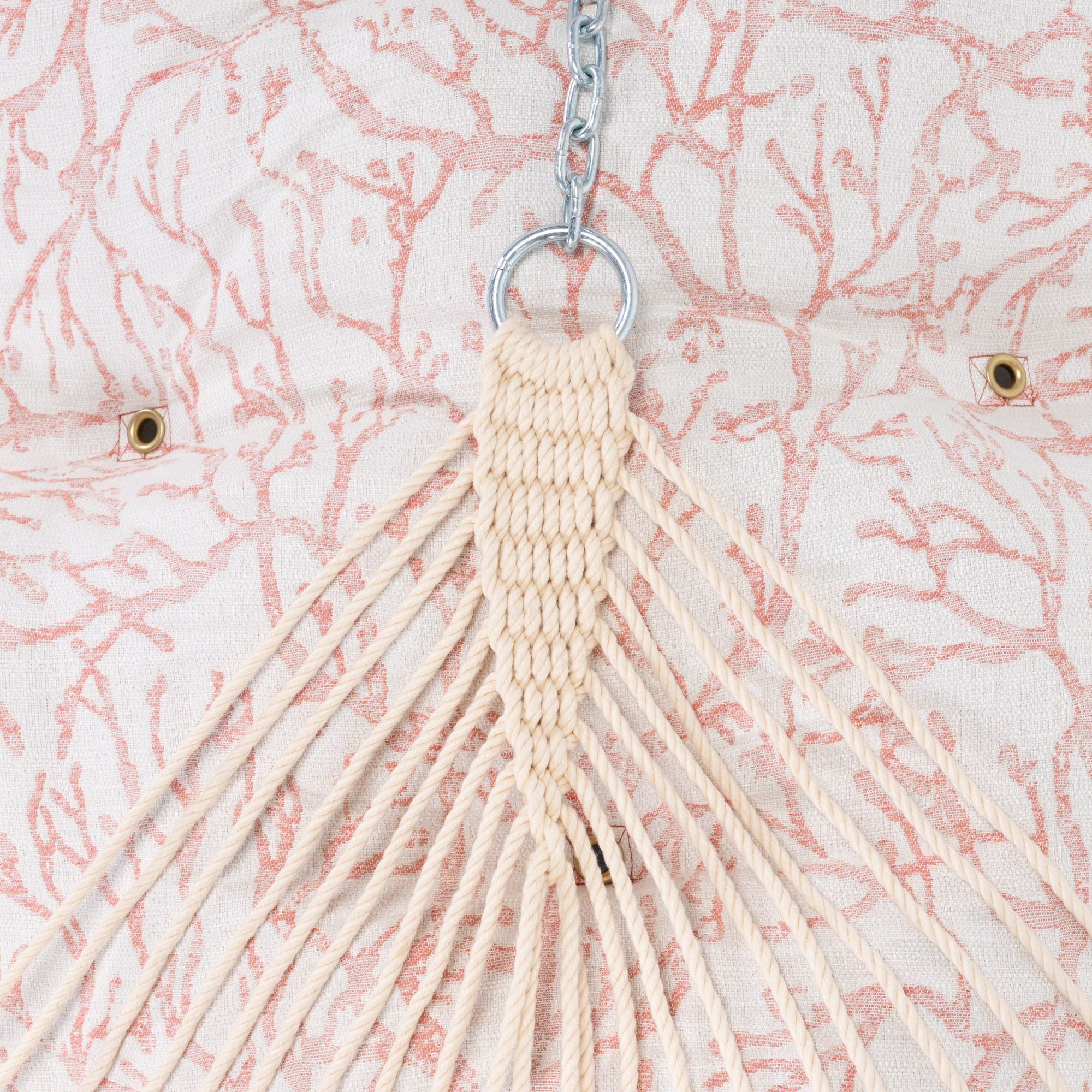 Handcrafted by Pawleys Island Hammocks, the Atoll Persimmon Tufted Hammock with Detachable Pillow is an exceptional blend of luxurious comfort and striking design, with its plush, cushioned surface providing the perfect retreat for unwinding. While its sophisticated pattern and rich textures elevate any outdoor space into a serene sanctuary where relaxation is always within reach. With the bold and inviting Atoll Persimmon pattern, this hammock showcases coral blended with earthy accents. Its lively yet sophisticated aesthetic adds a pop of color and a touch of elegance to any outdoor space, from patios to gardens or poolside escapes.
