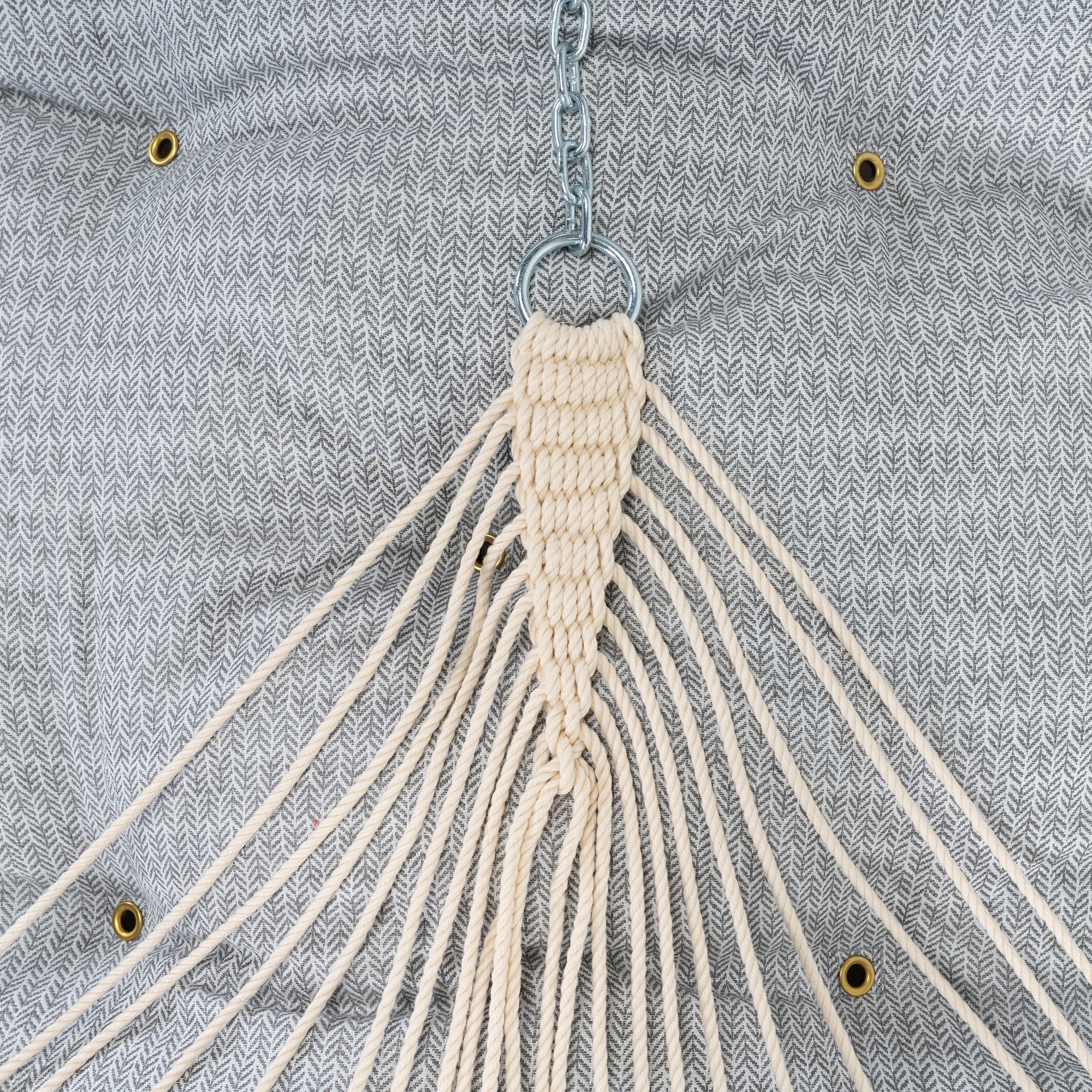 We plate all our hanging hardware with Zinc Plated Coating, including both tree hooks that come standard with our hammocks. The zinc plated coating prevents the accumulation of rust and ensures a longer outdoor life. Our very own One-piece ring-knot and chain, a product of years of development, permanently attaches the chain to the O-ring. This produces a hammock that is more durable and most importantly makes it impossible to lose the chain.