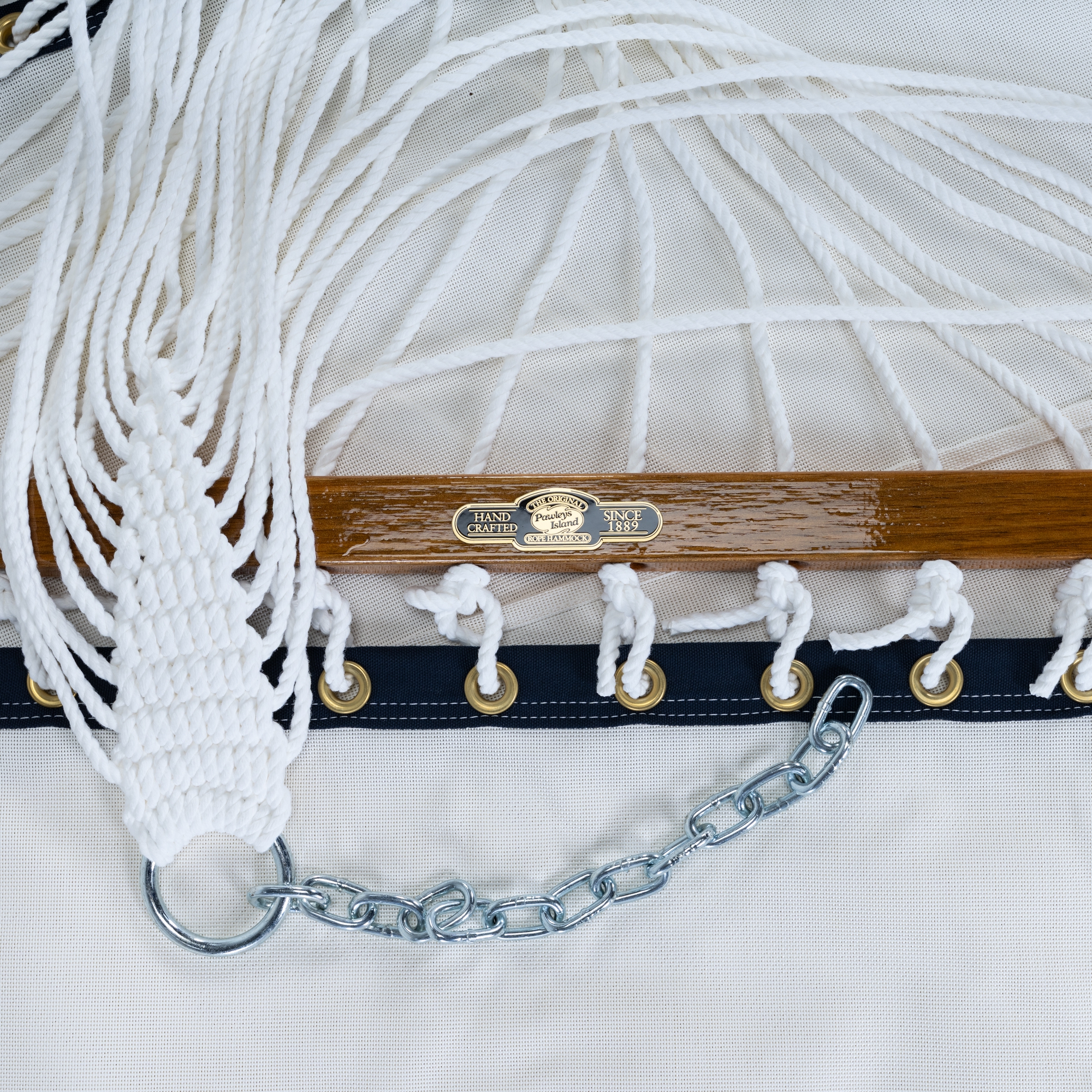 We plate all our hanging hardware with Zinc Plated Coating, including both tree hooks that come standard with our hammocks. The zinc plated coating prevents the accumulation of rust and ensures a longer outdoor life. Our very own One-piece ring-knot and chain, a product of years of development, permanently attaches the chain to the O-ring. This produces a hammock that is more durable and most importantly makes it impossible to lose the chain.