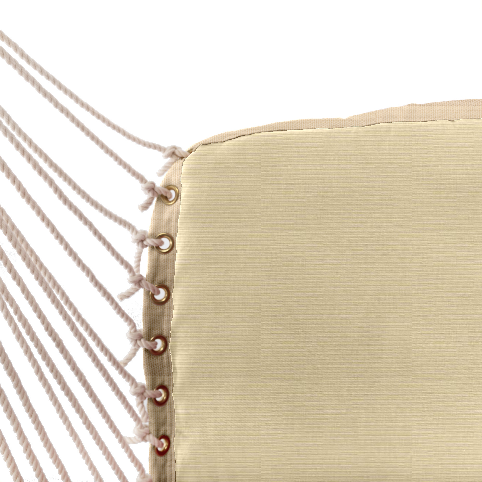 A wood that is naturally resistant to both rot and insect infestation, and has oils that repel water, Oak blends both exceptional strength and a handsome appearance. Our Oak spreader bars are repeatedly hand-dipped in honey-gold marine-grade varnish allowing a longer outdoor life and exceptional good looks. Our Oak spreader bars are a full 1 inch thick, compared to most other competitor’s spreader bars that measure at ⅞ inch. A thicker spreader bar allows for more stability, allowing the Swing Cushion to sit firmly between the Ring knots. Our spreader bars also feature countersink drilled holes. Countersink drilling is a technique that uses a trumpet drill bit that produces a hole with no hard angles, allowing the rope to pass through without any sharp edges to wear the rope.