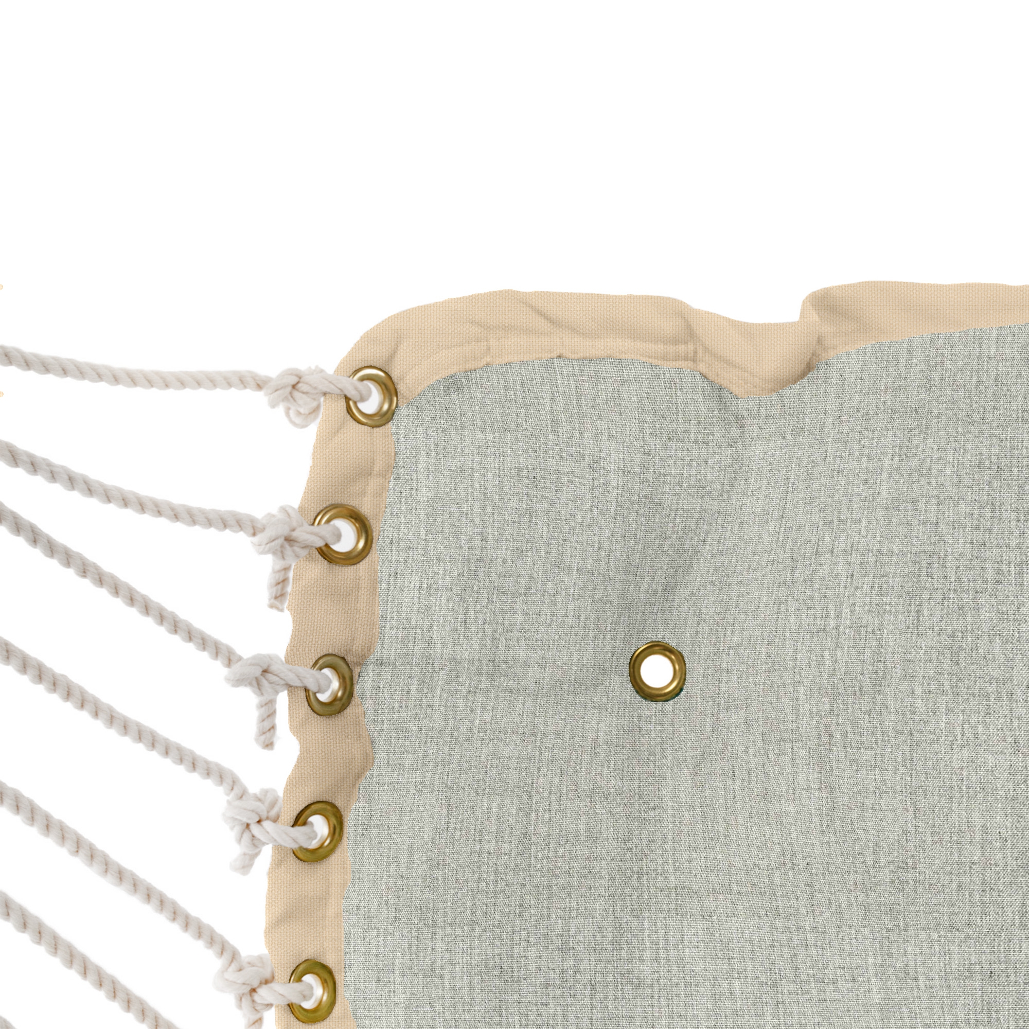A wood that is naturally resistant to both rot and insect infestation, and has oils that repel water, Oak blends both exceptional strength and a handsome appearance. Our Oak spreader bars are repeatedly hand-dipped in honey-gold marine-grade varnish allowing a longer outdoor life and exceptional good looks. Our Oak spreader bars are a full 1 inch thick, compared to most other competitor’s spreader bars that measure at ⅞ inch. A thicker spreader bar allows for more stability, allowing the Swing Cushion to sit firmly between the Ring knots. Our spreader bars also feature countersink drilled holes. Countersink drilling is a technique that uses a trumpet drill bit that produces a hole with no hard angles, allowing the rope to pass through without any sharp edges to wear the rope.